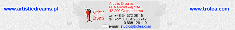 S³u¿ymy naszym klientom fachowym doractwem przy wyborze oraz projektem dla danej imprezy. Wykorzystaj nasze wieloletnie do¶wiadczenie w produkcji t± ciekaw± i ma³oznan± technik±. Na ka¿dym trofeum mo¿na umie¶æ dedykacjê. Wykonujemy napisy metod± grawertonow±, grawerowania mechanicznego, laserem oraz napisy wykonywane rêcznie. Nasz± ofert± specjaln± jest produkcja pieców do fusingu, stapiania szk³a wykonywanych na indywidualne zamówienie. Zapraszamy do wspó³pracy. Chcesz kupiæ, zamówiæ statuetki, zadaæ pytanie? - Kliknij poni¿ej i przejdŸ na stronê firmow¹: Artisticdreams